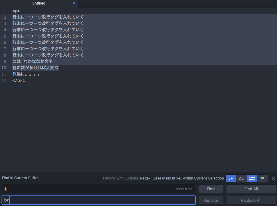 この「$」を改行である「<brp>」に書き換えていきますが、選択範囲以外の箇所も全てなってしまってはいけないので、今度はここの右側もアクティブにします。